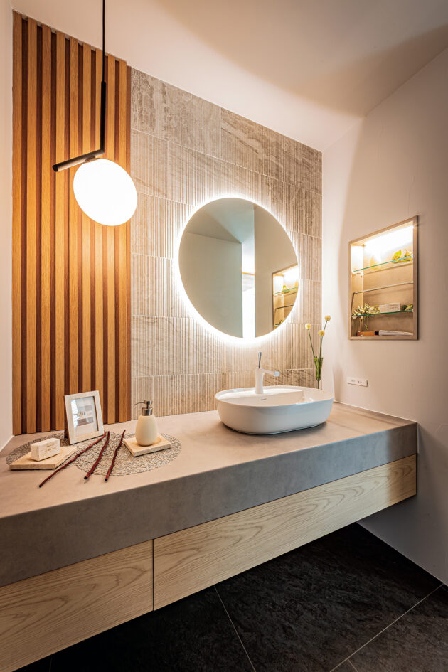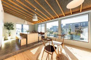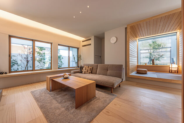 建物のコンセプトは、北欧と和の趣が混在する『ジャパンディ』。注目されているスタイルですが、ここでは手仕事による造作も多く、同社の確かな施工力とともにオリジナリティーあふれるデザインを各空間で堪能できます。随所に用いた無垢材と、光を柔らかく拡散する塗り壁の組み合わせが落ち着きを演出。天井や床(近く)までの開口部との相乗効果で、上質なゆとりやくつろぎを感じる人も多いはずです。