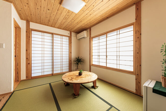 飫肥杉の「音響熟成木材」と半永久的にクリーンな空気をつくる「幻の漆喰」などの自然素材を用い、風や光を取り込む住まいづくりを行っているバリア・フリー工房。今回紹介するのは、そんなこだわりを貫く同社社長の自宅です。実は、2024年夏の竜巻により住居部分が損壊。「せっかくなら、当社らしいリノベーションをやろう」と、ご夫婦で何度も話し合いながらプランを構築したと言います。