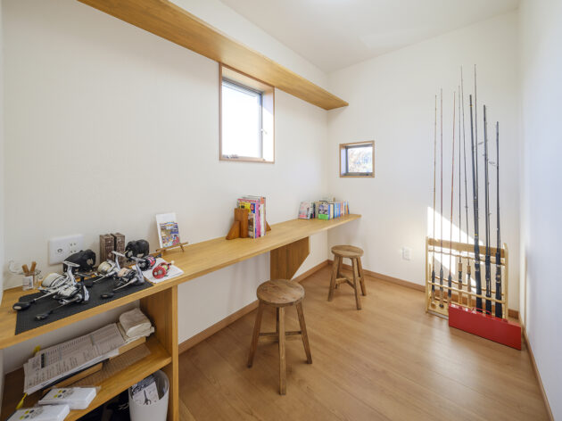 まず目を引くのは、玄関を開けてすぐに広がる土間スペース。「見学会で土間のある家を見て、ぜひマイホームにも採用したいと思ったんです」というご主人の要望に応え、自転車やアウトドアグッズを置ける十分な広さを確保しました。また、「日本には、和室や障子等といったすばらしい文化があることを子どもに伝えたい」というご主人の思いをくみ取り、リビング東側に小上がりの和室を配置。さらに障子窓を開けることで土間ともつながります。
