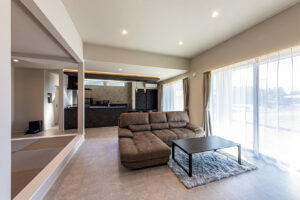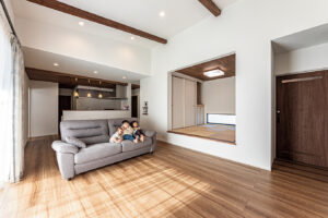 細部にまでこだわったカリフォルニアスタイルの住宅は、ほぼ初めての試み。S様ご夫妻の確立したイメージに近づけるため、試行錯誤しながらも楽しく挑戦することができました。大まかな間取りは奥様の要望ですが、和室は特別感を高められるよう「小上がりにしては」と提案を。光や風がよく入る、開放的な空間づくりにも注力しています。