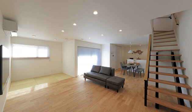 以前から考えていた住まいづくりを本格化させたOさんご夫婦。土地探しからのスタートで二人が頼ったのは、長い付き合いで気心の知れたヒラシマの営業担当でした。新居に暮らすころには家族が増えるため、安全性・快適性に対してこだわる部分があったそう。その点、同社が新築住宅で導入しているのはパナソニックのテクノストラクチャーEX工法。制震ダンパーを備え、震度7の地震の後でも住み続けられる強さを持ちます。1棟ごとに構造計算や、4D災害シミュレーションが行われることも信頼が厚い理由です。  また、Oさんはビルダーが窓口となって建築家とつくる『オーダーメイドテクノ』を選択。要望や予算をベースに間取りやスタイルをプランニングしてくれるので、自分たちだけでは描けなかった暮らしをかなえることも可能です。「どこよりもリラックスできる場所にしたい」との思いが反映されたO邸のプランでは、外からの干渉を最小限にする配慮が随所に。限られた敷地を上手に活かし、家事も育児も趣味も自分たちらしく楽しめる住空間が実現しました。GX志向型住宅でもあり、省エネと快適さを両立させています。