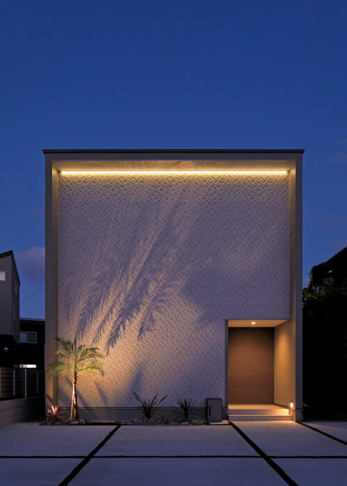 アートな雰囲気をまとう、シンプルな外観。住宅らしからぬデザインですが、グレー×ブラウンの落ち着いた配色にロックガーデンが映え、見る人に安らぎを感じさせてくれます。大きな道路に面しているため、正面には窓を設けず、玄関ドアも開閉時に室内が見えないよう位置を工夫しました。住宅地や道路沿いなど、外からの干渉が気になる立地ではうれしい配慮です。