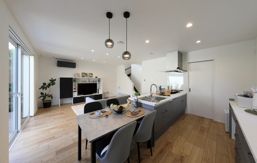 室内も外観同様、シンプルさを意識した仕上がりに。パナソニックビルダーの利点を生かしたハイグレードな住宅設備も見逃せません。1階はLDKと集約された水回り、2階は個室中心とゾーニングも明確。個々で過ごす時間を大切にしながら、家族だんらんを満喫できる暮らしが始まります。