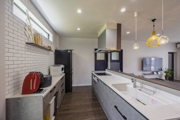 D様邸は、家族のコミュニケーションを大切にしつつ、個々のプライバシーも尊重したLDK中心のレイアウトが特長。内装にグレー系の落ち着いた色を用い、開放感と落ち着きを両立させています。水回りを集約しているので、パブリックゾーンに生活感が出にくい点もポイント。理想とするスタイルを丁寧に聞き取り、カタチに仕上げた一棟です。