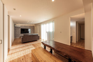 「狭くても広く感じるような開放感があり、カフェっぽい雰囲気」がNさんの希望。その思いにどう応えるか。岩切建設が出した答えは、リビング・ダイニングと、デッキ、広々とした庭を一体にした間取りです。大きな窓を取り入れデッキとリビング・ダイニングをつなぎ、その向こうに庭が広がる。そうすることで庭までが家のような感覚になるのです。また、扉をガラス戸にして扉の向こうを可視化する工夫も。閉塞感がなくなり、より広がりを感じることができます。