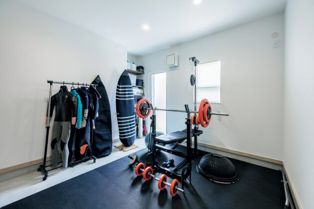 カリフォルニアスタイルの外観、土間のトレーニングルーム、便利な動線などコンセプトが明確だったS様。心地よいリビングにするために天井を高くしたことや、ランドリールームから庭へ続く水回り動線などは、経験を踏まえて提案しました。どのようにも建てられる広い土地でしたが、先々の暮らし方も考えてプランニングしました。