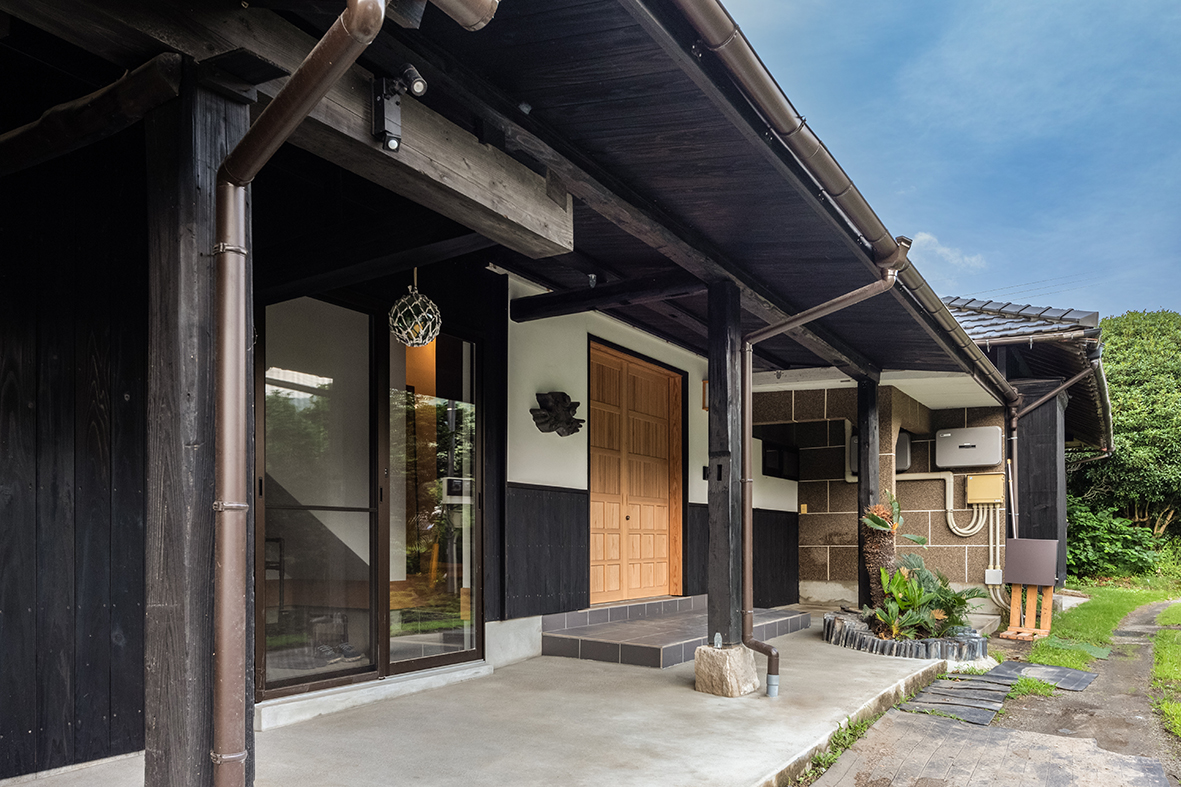懐かしさを感じる里山の風景に、凛とした存在感を放つM邸。墨色をまとう板壁と漆喰仕上げの美しいコントラストが目を奪います。加えて特長的なのが東西に長いデザイン。もともとは奥様の祖父母の家で、母屋と厩舎(きゅうしゃ)をつなげて改築したものでした。幼い頃から大好きな場所だった古い家を、リノベーションして住み継ぐことを決めた奥様。強い思いが粋の家との出合いへと導いたのです。