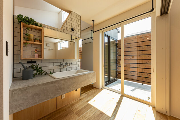 南面に道路や住宅がある敷地を考慮し、北面に伸びやかな景色を取り込む大開口を用いたT邸。その窓は壁付けのキッチンに備わり、家事をより楽しい時間にアップデートしています。一方で南面は、外観写真を見ると開口は最小限。実は、ウッドフェンスの向こうにテラスと掃き出し窓が! 少しでも南面を活かすため、建築士の提案でプラスされた空間です。視線は遮りつつ、風は通すフェンスがプライバシーを確保。天気のいい日は家族で食事ができるようにと、T邸は『朝食テラスのある家』と名付けられています。