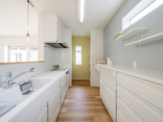 まず重視したのが耐震性。基礎からこだわり、建築基準法の1・5倍の強さである耐震等級3(最高レベル)をフラット35適合証明にて取得しています。間取りでの大きな特長は、楽しみを共有できる空間づくり。音楽好きなご主人が得意分野を活かし、リビングの映像・音響機器の設置や配線を主導。壁裏やニッチといった専用スペースを設けることで、テレビ周りが驚くほどスッキリとした印象に。リビングとつながる小上がりのプレールームには電子ピアノやギターを置く予定。家族がいつでも生の音楽に触れられる環境を整えています。また、機能的な収納や水回り設備など、徹底して自分たちらしいスタイルを確立。キッチン奥のパントリーに調理家電を置いたり、独立したランドリールームを用意したりと、生活感を表に出さない工夫も見逃せません。