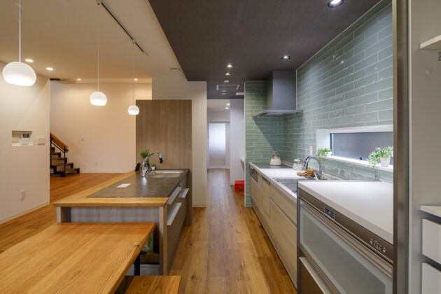 外から見るとプライベートを確保した造りですが、家族が憩うLDKは縦にも横にも広がる空間を演出。特に住まいの中心に位置するリビングは、3mを超える天井高で開放的に。奥に続くダイニング・キッチンは、テラスデッキや庭との一体感を大切にして、料理も食事も楽しめる環境を整えました。屋外との連携がスムーズなので、BBQやお庭でのカフェタイムも気軽にかないます。
