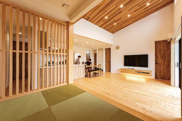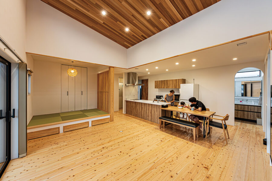 また、リビングは勾配天井を活かす吹き抜けを採用しました。ヒノキやスギなど天然木の設えを多く用いたのは奥様の要望であり、上原林業も得意とするところ。腰掛けにちょうどいい畳間と相まって、ついゴロンと横になりたくなるくつろぎ感がたまりません。