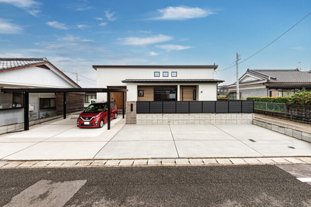 学校が近く、育児も暮らしも利便性の高いエリアに建つY邸。ゆとりの駐車スペースが確保されているのは、「多くの人が集まる家にしたい」というテーマのもとに計画されたから。室内もLDKをゆったりと。小上がり和室をセットにしたワンフロアでシチュエーションに応じた使い方をかなえます。