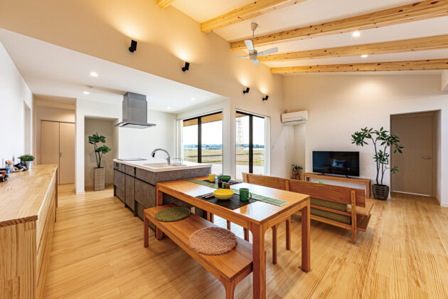 土地探しのサポートから山下住宅に依頼していたWさんは、「縁のある新富町で良い場所が見つかって家づくりが始まりました」と語ります。道路に隣接しながらも一方はのどかな景観が開けている敷地を同社は丁寧に読み解き、季節の変化に富む景観を愛でながらゆったり過ごせるプランを提案。キッチンは、視線の先に伸び伸びとした田園風景が広がり、作業時間を癒しの時間に変えてくれそうです。さらに、各個室からも風景を楽しめるよう、建物をL字形にデザインした点もポイントです。