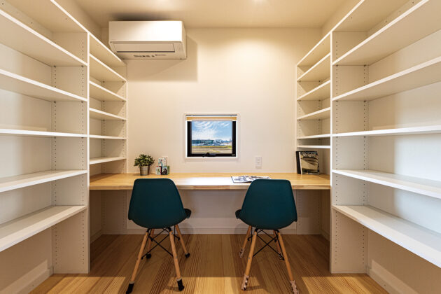 ご夫婦の要望には、「自宅で仕事をするときに子どもの睡眠などを邪魔したくない」というものも。そこで、子供部屋と書斎・主寝室の間にLDKを配置。物理的な距離を取りつつ気配を感じられる、バランスの良いレイアウトに。リビングの横には軒の深い広々ウッドデッキ。日差しをさえぎりながら、子どもを安全に遊ばせられそうです。また、帰宅してすぐ手洗いできる玄関ホールの洗面所は、家族の健康管理に役立ちます。利便性を損なわずに、自分たちらしく暮らす。そんな豊かな時間を期待できる住まいです。